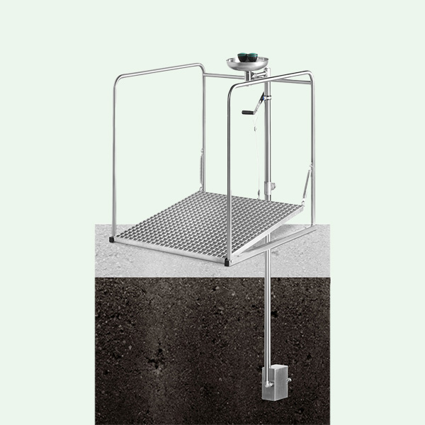 - Betätigung der Augendusche über Fußtrittrost aus feuerverzinktem Stahl, Befestigung über Edelstahlseil an Winkelumlenkung, Abmessungen (B x T): 800 x 800 mm