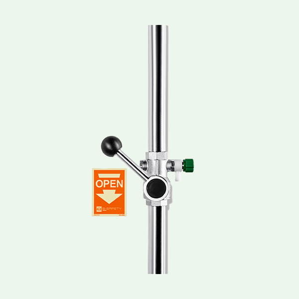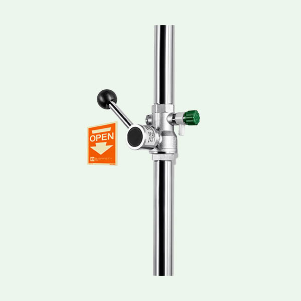 Das Notduschenventil besteht aus einem robusten Kugelhahn mit Trinkwasserzulassung. Der Volumenstrom beträgt mindestens 60 Liter / Minute bei 1 bar Fließdruck.