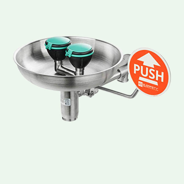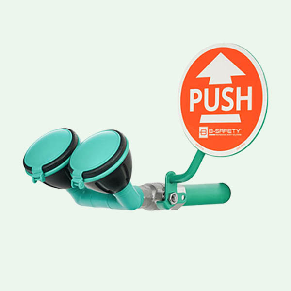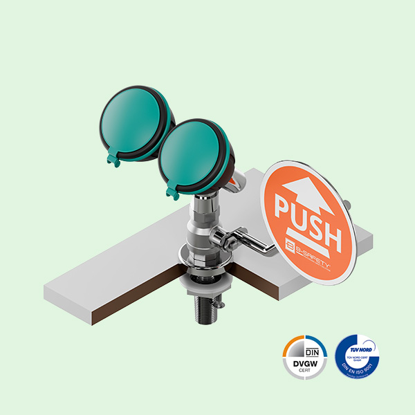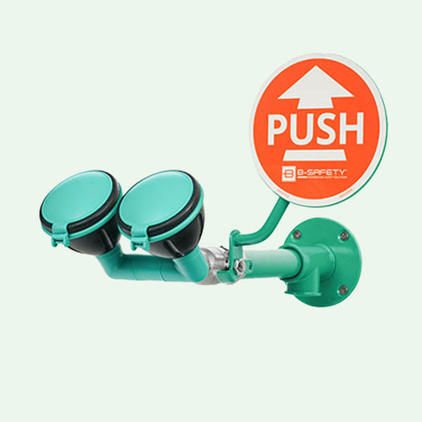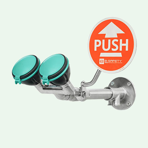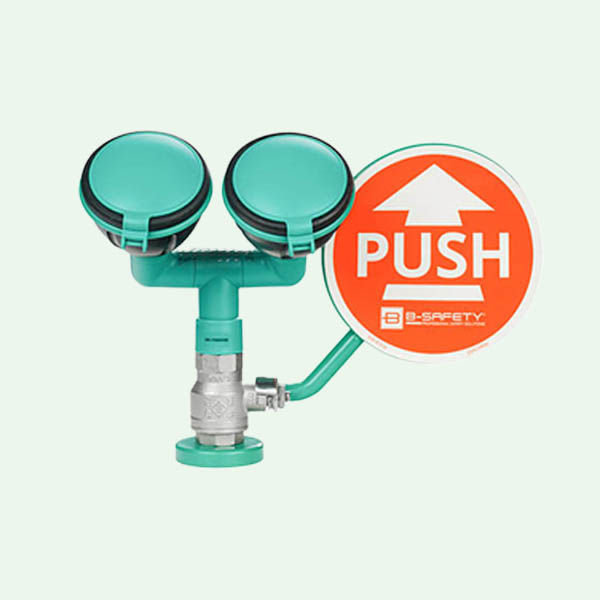 Diese Duschen sind immer gut von allen Seiten sichtbar. Der große PUSH-Hebel ist langnachleuchtend und somit auch im Dunkeln und Sichtproblemen gut zu finden. Die Sicherheits-Augenduschen sind mit B-SAFETY Hochleistungsbrauseköpfen ausgestattet, sodass diese für eine großflächige Wasserverteilung sorgen. Dadurch werden auch die Regionen um die Augen versorgt und die Platzierung der Augen in dem Wasserstrahl ist unproblematisch.